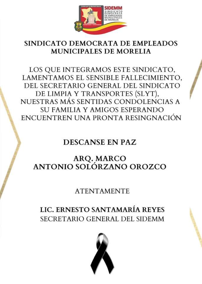 Por su parte, el Sindicato Demócrata de Empelados Municipales de Morelia (SIDEMM), también utilizaron sus redes sociales, para lamentar la pérdida del líder, enviando condolencias a sus familiares.