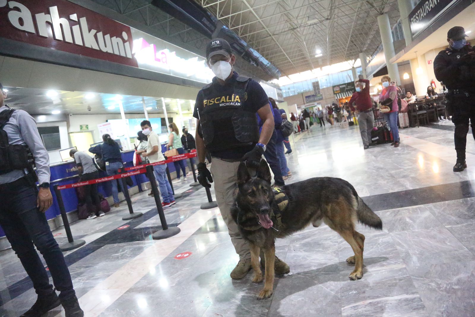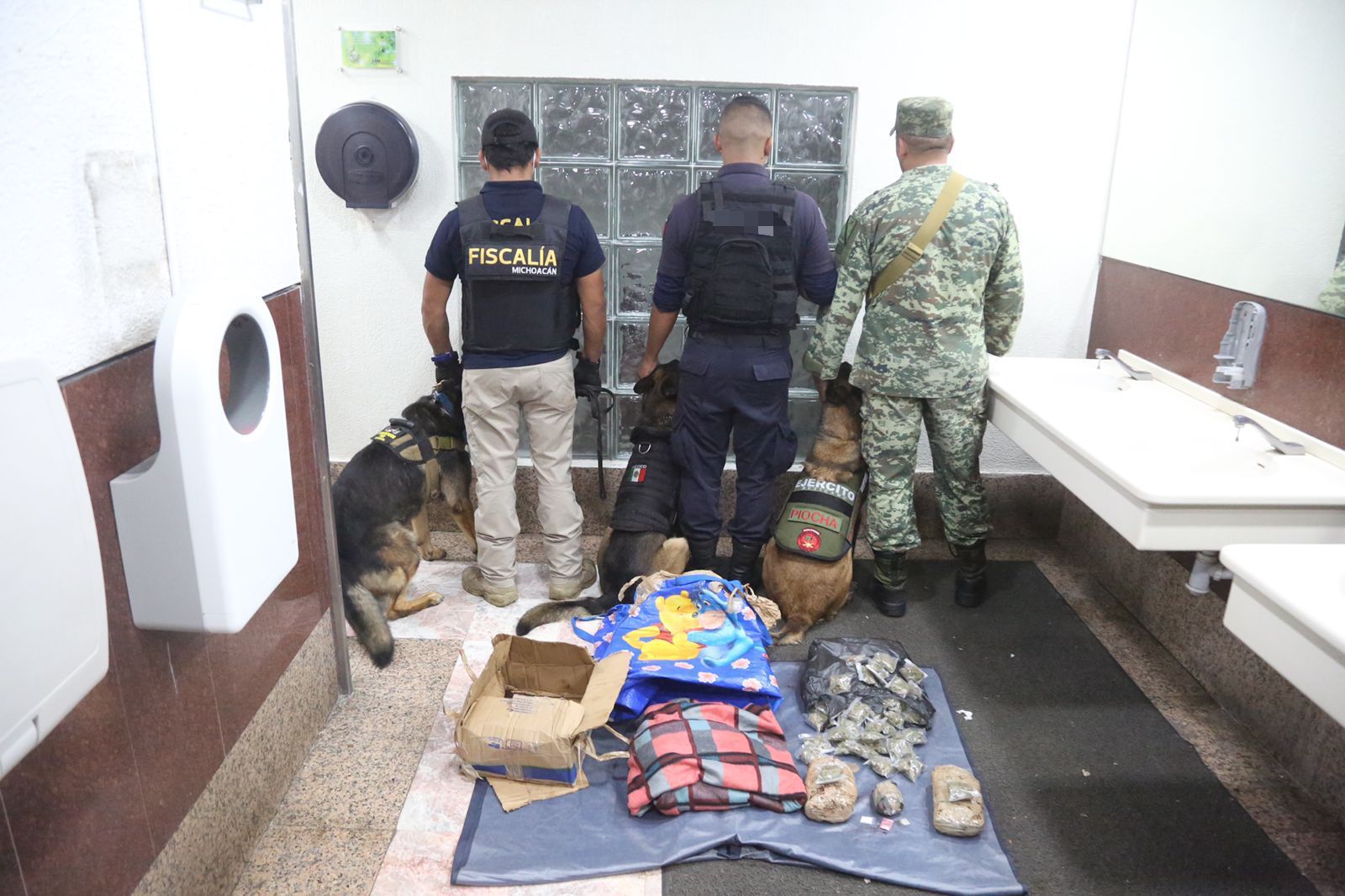 El operativo efectuado anoche en la Terminal de Autobuses de Morelia (TAM), dio como resultado que los caninos de la Guardia Civil, Ejército Mexicano y FGE localizaran una caja de cartón en un baño para caballero de las citadas drogas, las cuales se encontraban envueltas con cinta canela y café disperso para disimular el olor.