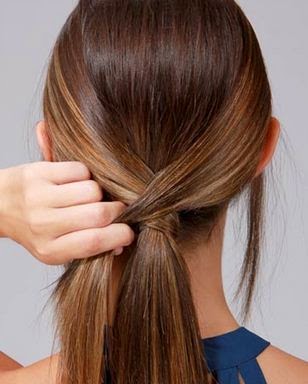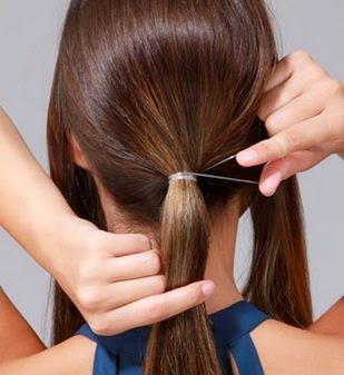 3. Cuando se unan las dos partes, las sujetas junto a todo el cabello con una goma y liga, de tal forma que te quede una coleta baja.