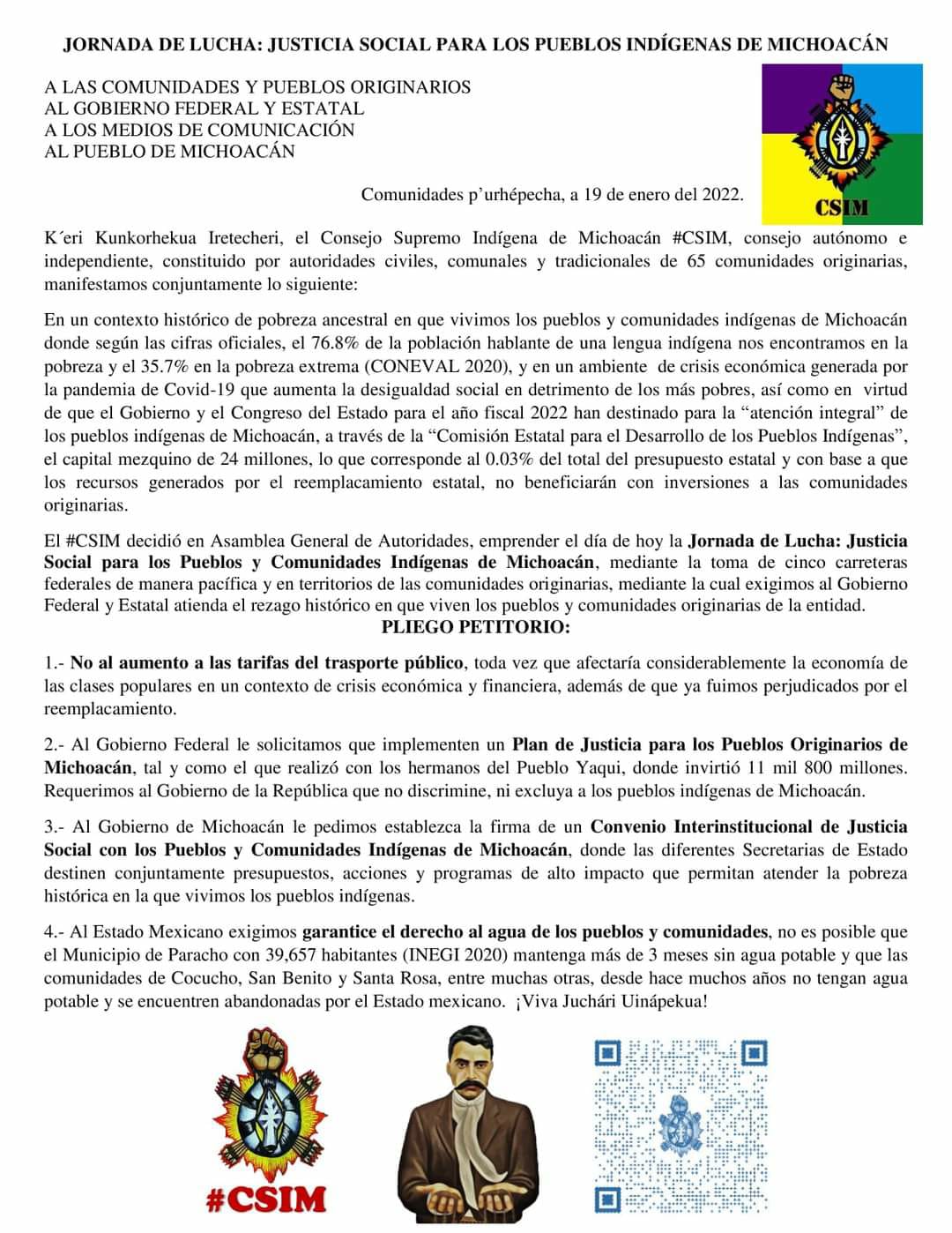 En un contexto histórico de pobreza ancestral en que vivimos los pueblos y comunidades indígenas de Michoacán donde según las cifras oficiales, el 76.8% de la población hablante de una lengua indígena nos encontramos en la pobreza y el 35.7% en la pobreza extrema (CONEVAL 2020), y en un ambiente de crisis económica generada por la pandemia de Covid-19 que aumenta la desigualdad social en detrimento de los más pobres, así como en virtud de que el Gobierno y el Congreso del Estado para el año fiscal 2022 han destinado para la “atención integral” de los pueblos indígenas de Michoacán, a través de la “Comisión Estatal para el Desarrollo de los Pueblos Indígenas”, el capital mezquino de 24 millones, lo que corresponde al 0.03% del total del presupuesto estatal y con base a que los recursos generados por el reemplacamiento estatal, no beneficiarán con inversiones a las comunidades originarias.