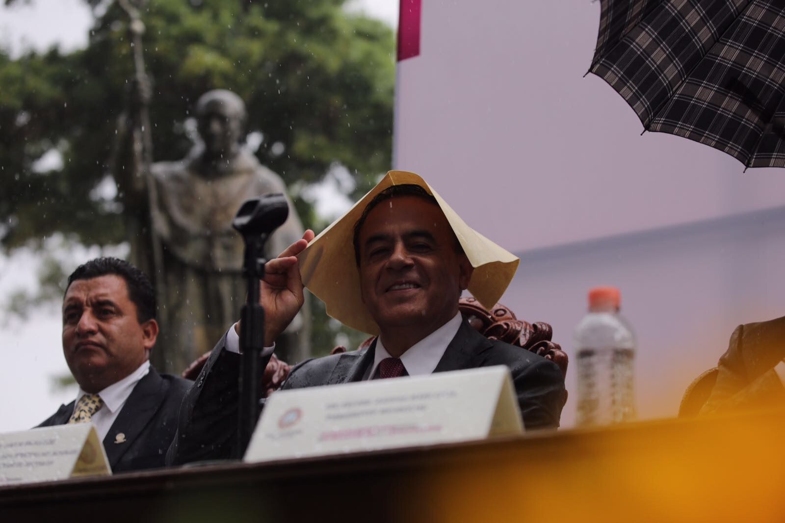 Otros, como el edil de Pátzcuaro, Víctor Manuel Báez y el diputado, Pascual Sigala Páez, buscaron protegerse de la lluvia con simples hojas.