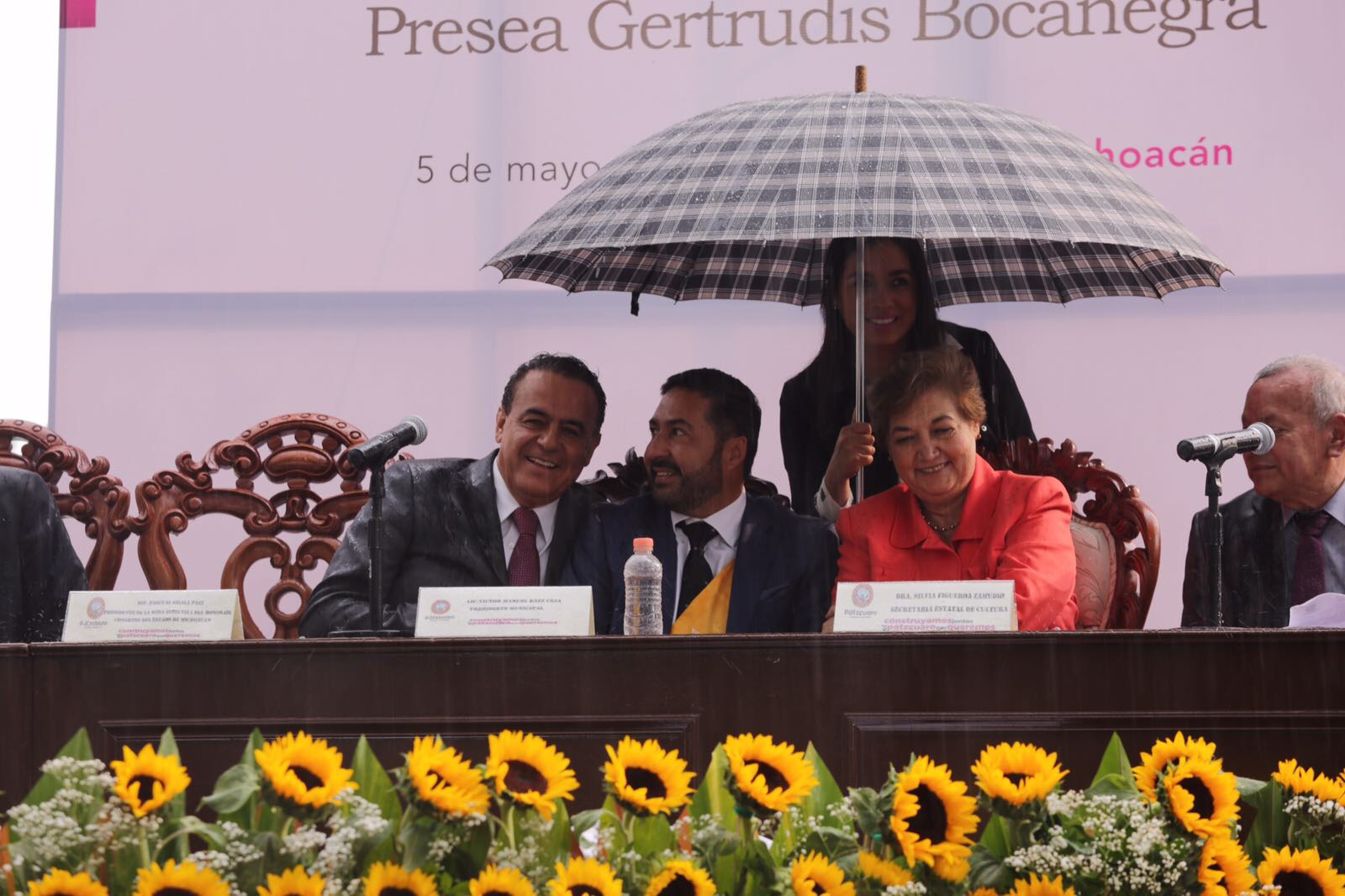 Pátzcuaro, Michoacán.-Entre lluvia, reclamos a un “gobierno corrupto” y el reconocimiento del gris escenario que enfrentan los comunicadores en la actualidad, la destacada periodista, María del Carmen Aristegui Flores recibió la presea Gertrudis Bocanegra, entregada por el Ayuntamiento de Pátzcuaro.