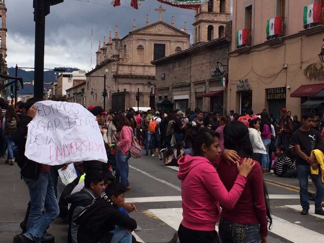 Con consignas como como “somos estudiantes y tenemos derecho a estudiar”, “queremos lugares en la michoacana” cerca de 300 jóvenes pertenecientes a la Coordinadora de Universitarios en Lucha y al Movimiento de Aspirantes Rechazados están bloqueando la circulación sobre la avenida Madero.