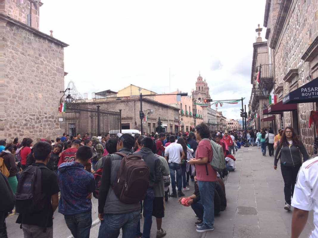 Llegan jóvenes aspirantes a ingresar a la UMSNH, al primer cuadro del Centro Histórico de la capital michoacana, en este momento se encuentran apostados afuera del Congreso del Estado, para posteriormente avanzar a Palacio de Gobierno y ahí romper filas.