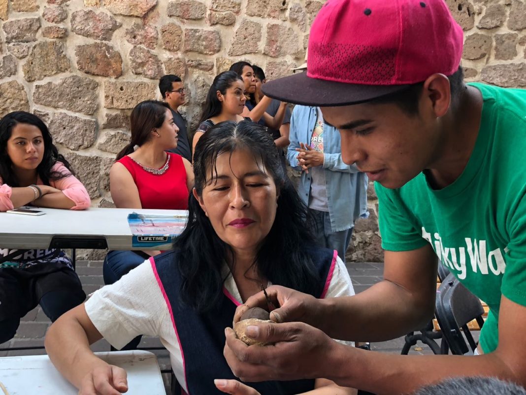 Uno de los artesanos es representante de las marcas colectivas de la tenencia de Capula y explica lo que se instruirá a por lo menos 50 asistentes a este curso que se desarrolla sobre la calle peatonal del Nigromante.