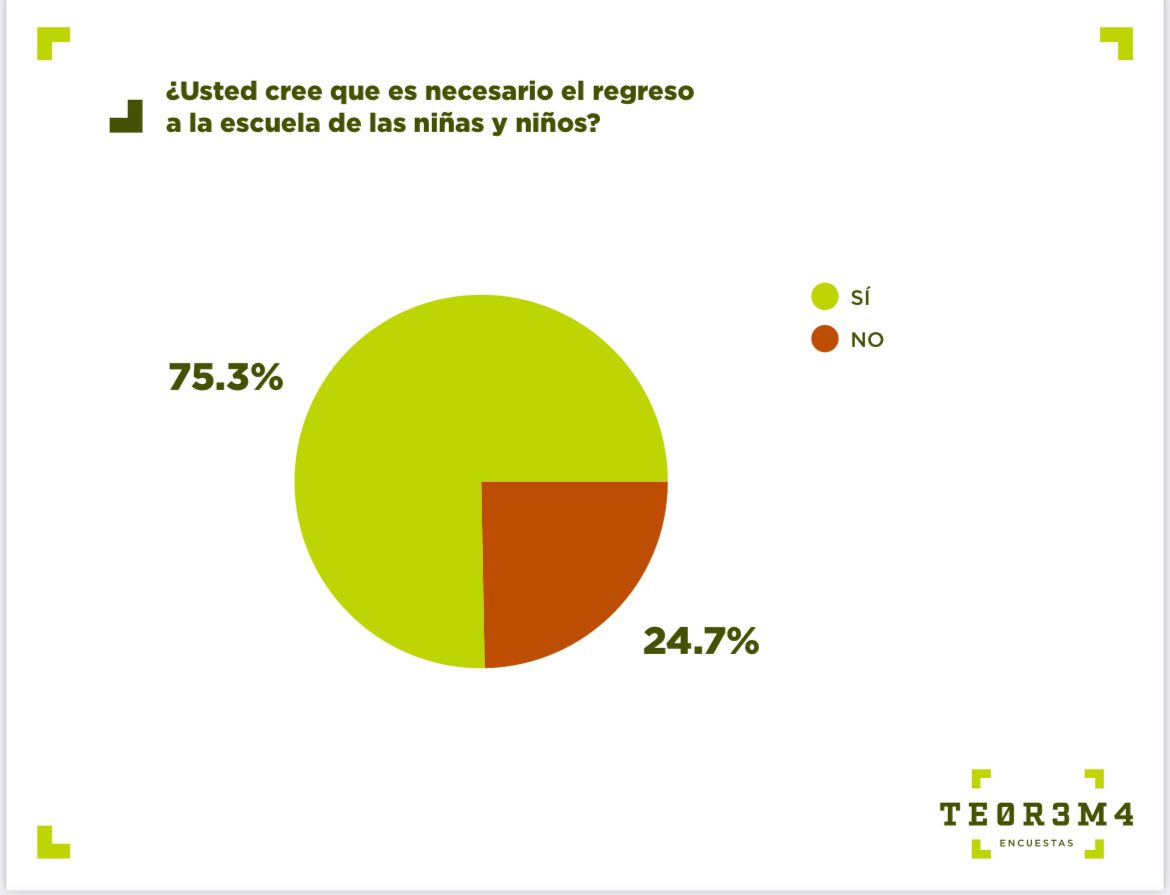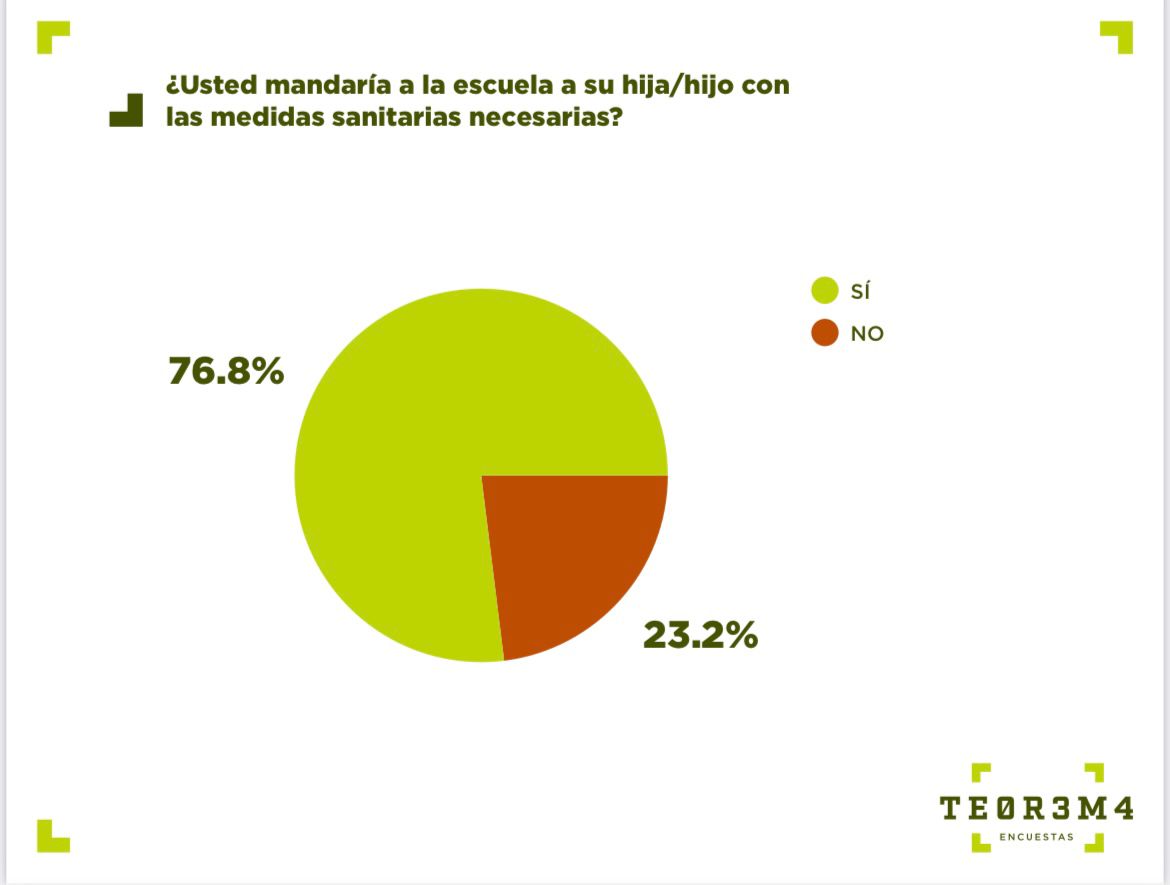 De acuerdo a la última encuesta de Teorema, realizada en Michoacán con mil 191 muestras, el 76.7 de los encuestados manifestaron que sí enviarían a sus hijos a clases con las medidas sanitarias necesarias, mientras 23 por ciento expresaron que no.