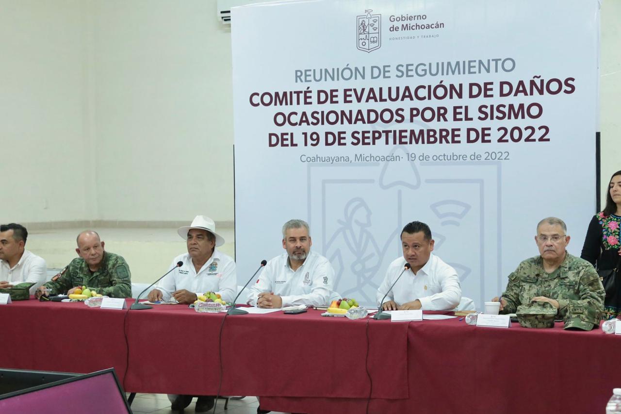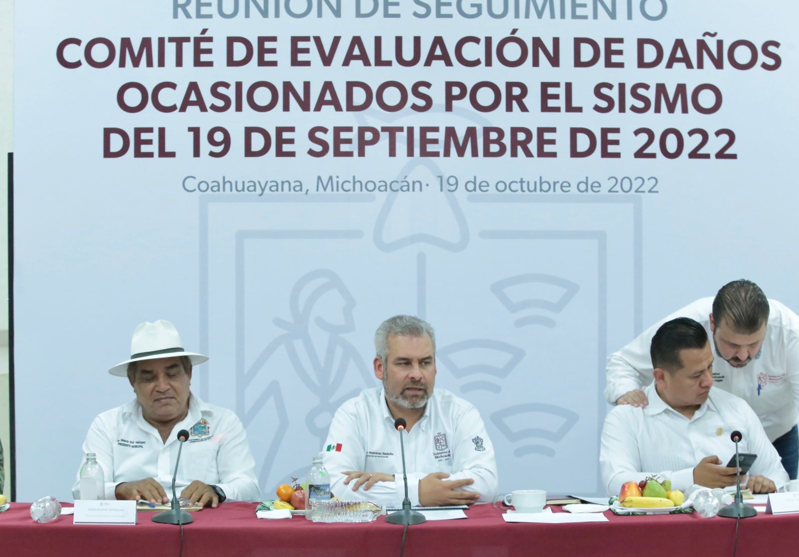 Coahuayana, Michoacán, 19 de octubre del 2022.- El gobernador Alfredo Ramírez Bedolla encabezó la reunión del Comité de Evaluación de Daños ocasionados por el sismo del pasado 19 de septiembre, donde informó que en noviembre inicia el proceso de reconstrucción de 463 viviendas con pérdida total.