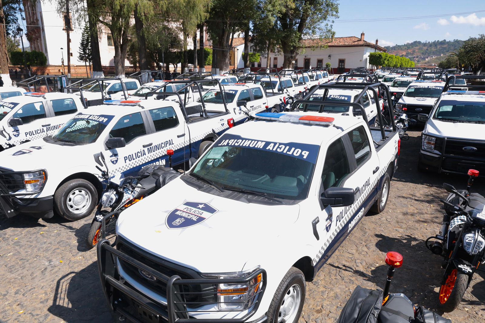 En total, 44 municipios y cuatro comunidades indígenas recibieron alrededor de 2 mil 200 bienes, entre los que destacan 57 patrullas pickup, 67 motocicletas y 850 chalecos balísticos, que ascienden a los 360 millones de pesos.
