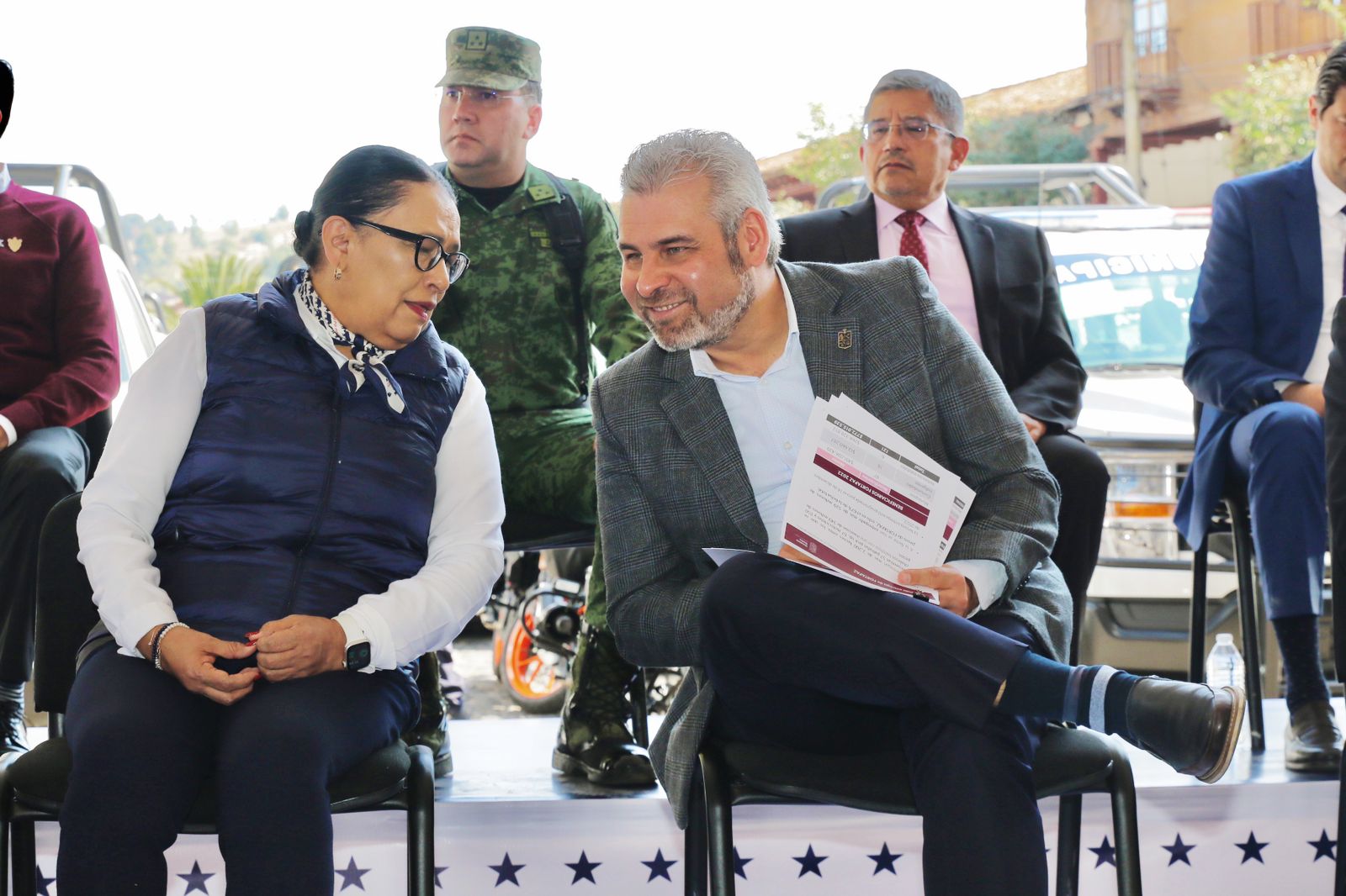 Pátzcuaro, Michoacán.- El gobernador Alfredo Ramírez Bedolla, acompañado de Rosa Icela Rodríguez Velázquez, secretaria de Seguridad y Protección Ciudadana del Gobierno Federal, encabezó la segunda entrega de patrullas y equipamiento a municipios que forman parte del Fondo de Fortalecimiento para la Paz (Fortapaz).