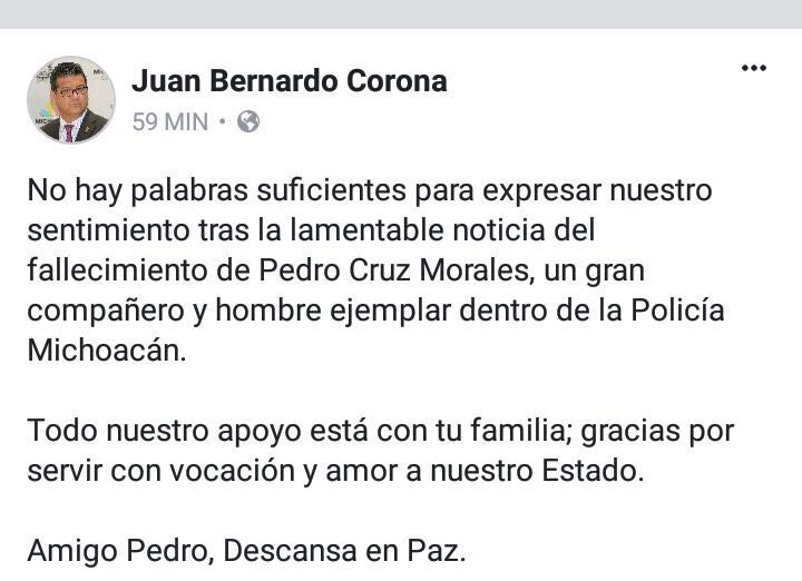 En días pasados, el titular de la SSP, Juan Bernardo Corona Martínez señaló que Pedro Cruz se debatía entre la vida y la muerte, tras las heridas recibidas por arma de fuego en el enfrentamiento en Arantepacua.