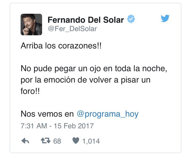 Fue mediante su Twitter oficial donde Fer del Solar dio a conocer que estaría en el programa estelar de Televisa. Al entrar al aire, platicó sobre su enfermedad y aprovechó para promocionar su nueva serie en la plataforma digital “Blim”, la cual lleva por nombre “Mula de tres”.