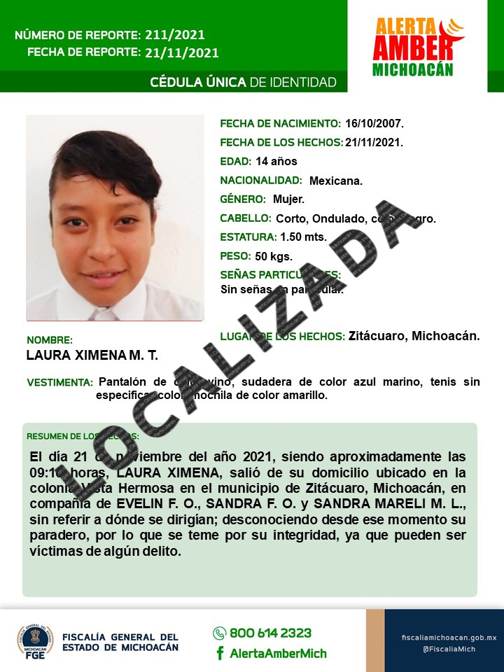MORELIA MICH., 4 de enero de 2022.- La Fiscalía General del Estado de Michoacán (FGE) en coordinación con autoridades del Estado de México, localizó sanas y salvas a cuatro menores de edad que fueron reportadas como desaparecidas en Zitácuaro.