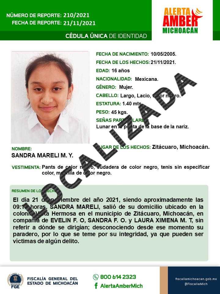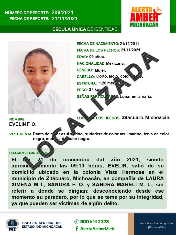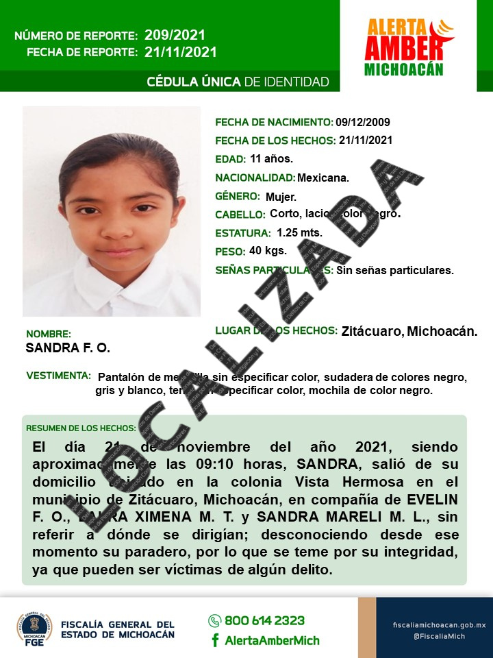 De las investigaciones revelan que el pasado 21 de noviembre S.M.M.Y. de 6, E.F.O. de 9, S.F.O. de 12 y L.X.M.T. de 14 años de edad, salieron de su domicilio ubicado en Zitácuaro sin referir a dónde se dirigían, por lo que, al temer por su integridad, fue presentada una denuncia.