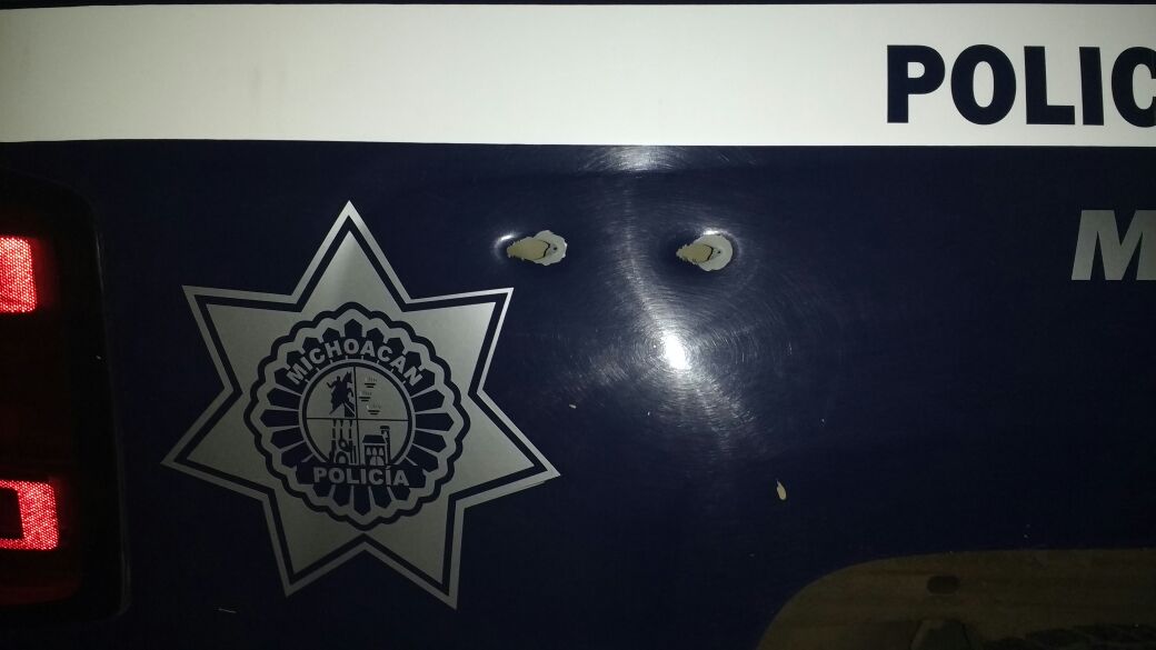 Durante la agresión, dos unidades de la Policía Michoacán resultaron con impactos de bala.