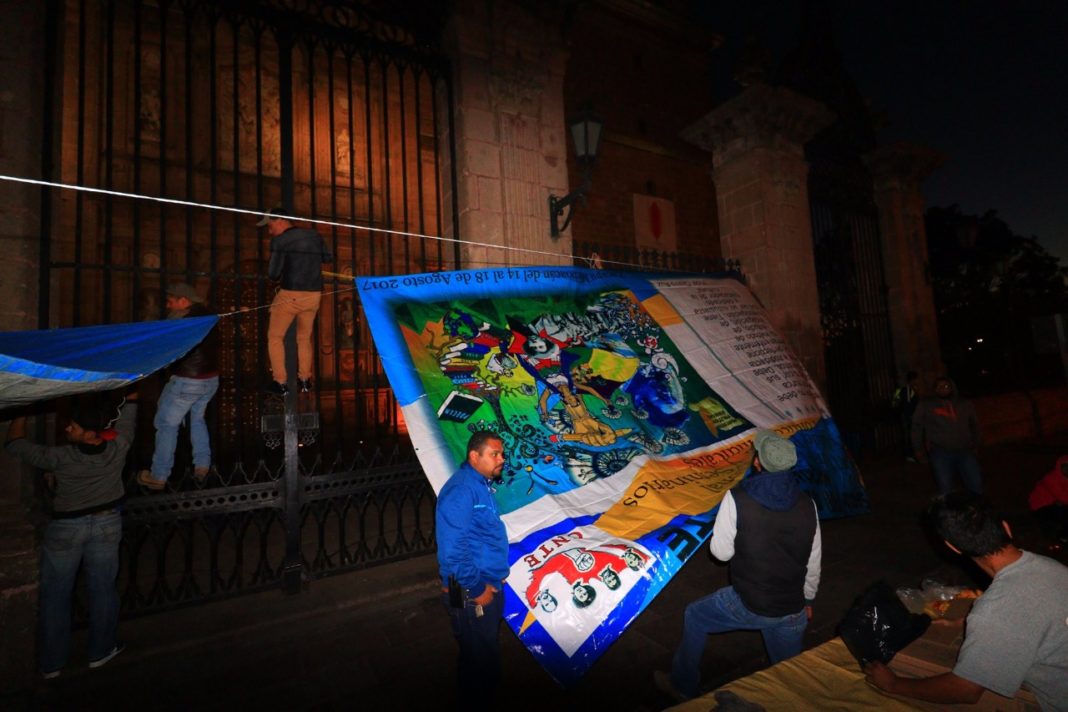 Morelia, Michoacán.- La falta de acuerdos entre la Coordinadora Nacional de Trabajadores de la Educación (CNTE) y Gobierno del Estado, derivaron en que la disidencia magisterial montara un plantón frente a Palacio de Gobierno, a espaldas de la Catedral de Morelia.