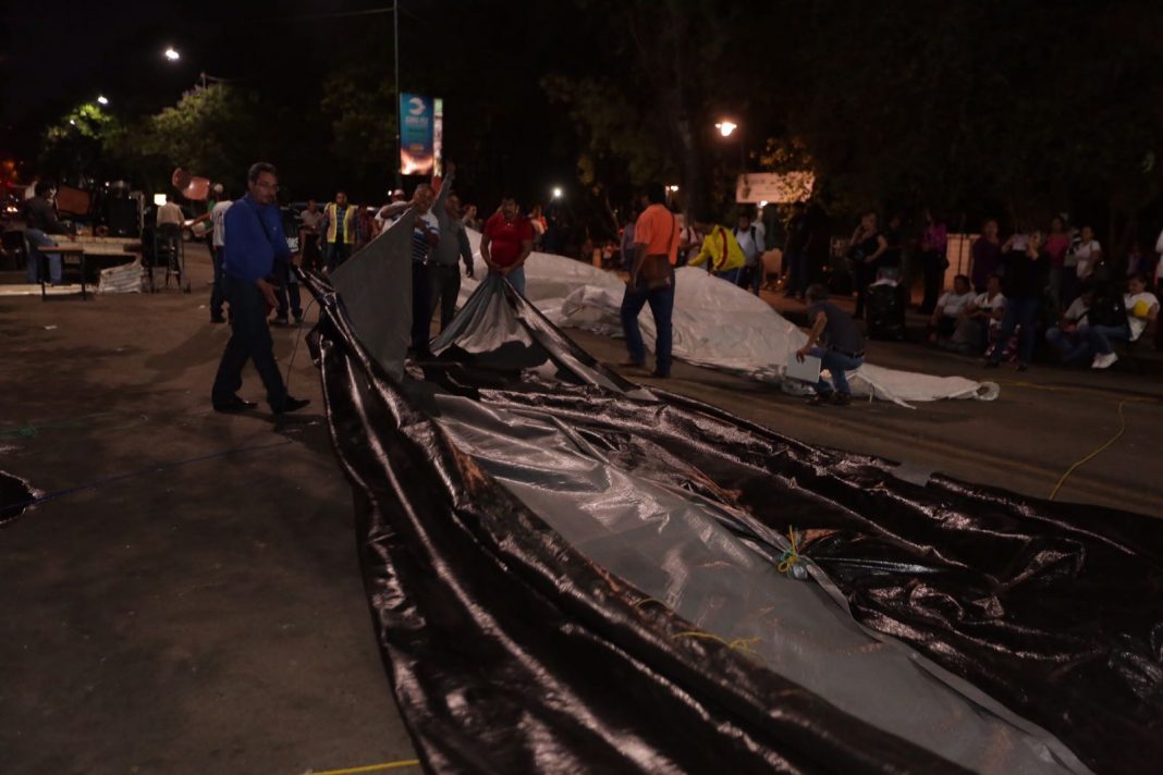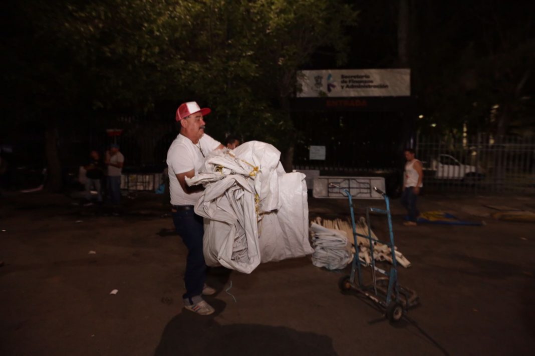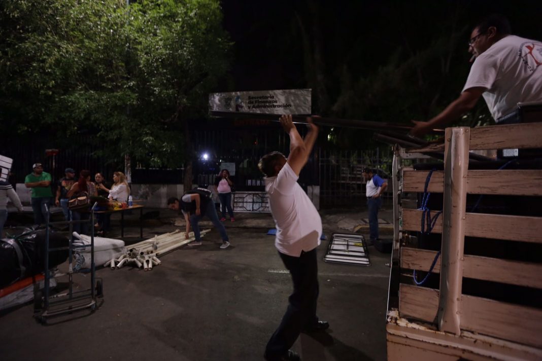 Morelia, Michoacan.- Luego de que el subsecretario de la Secretaría de Seguridad Pública, Carlos Gómez Arrieta, llegara al plantón que mantiene la Coordinadora Nacional de Trabajadores de la Educación (CNTE), los profesores iniciaron con el levantamiento de casa de campaña y lonas que tenían frente a la Secretaría de Finanzas y Administración.