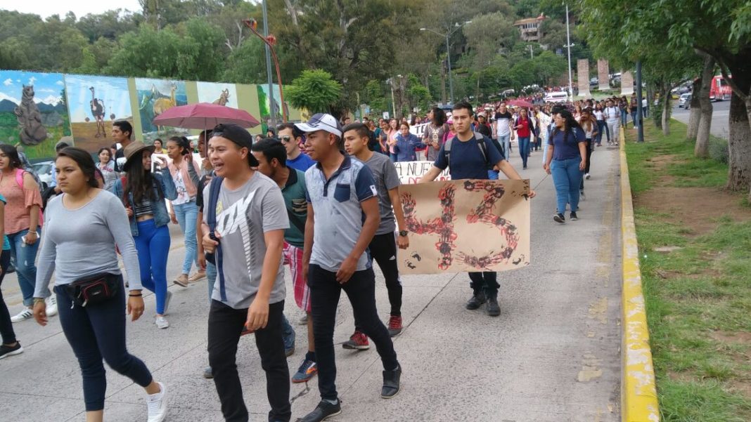 Morelia, Michoacán.- ¡Ayotzinapa vive, la luche sigue! Fue la voz que retumbó este día en algunas calles de la capital michoacana, y es que este martes se cumplieron tres años de la desaparición de 43 jóvenes de la Escuela Normal Rural “Raul Isidro Burgos” de Ayotzinapa, Guerrero, por lo que los padres de éstos, normalistas de la Organización de Normales Oficiales del Estado de Michoacán (ONOEM), algunos moradores de casas de estudiante e incluso alumnos de la Universidad Nacional Autónoma de México (UNAM) campus Morelia marcharon este día.