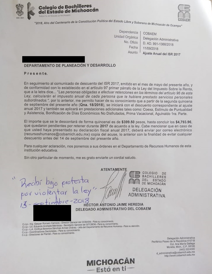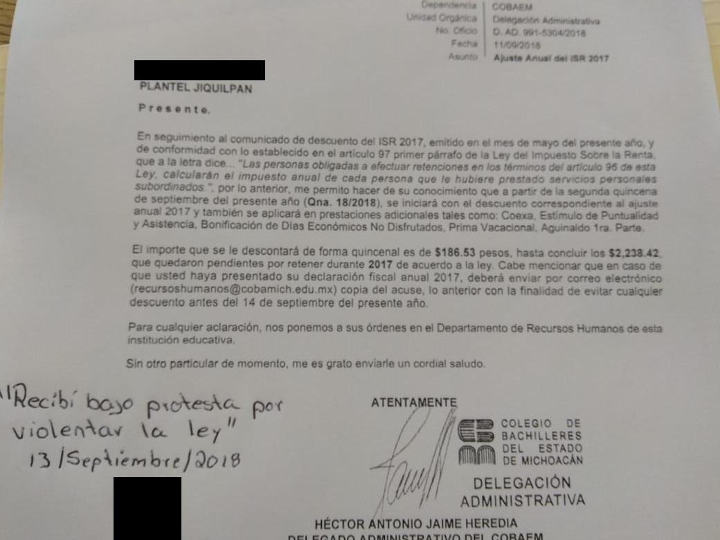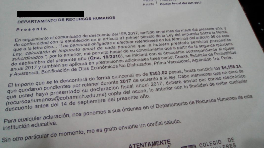 Morelia, Michoacán.- La autoridad del Colegio de Bachilleres del Estado de Michoacán (Cobaem) habría incurrido en una irregularidad al notifica, mediante un oficio que se les descontará el Impuesto Sobre la Renta (ISR) en el salario de alrededor de 2 mil 500 y 2 mil 800 trabajadores del subsistema educativo, pese a que existe un amparo contra la medida, además de que el Código Fiscal de la Federación (CFF) se los impide.