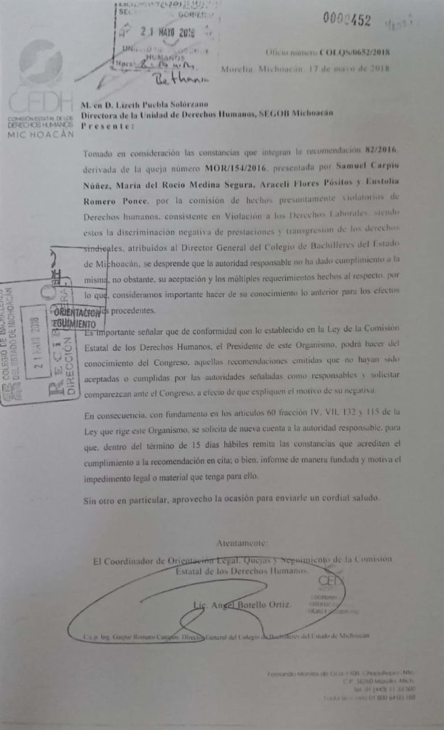 Este día, los agremiados del Stucobaem, Eustolia Romero y Samuel Carpio acudieron a la CEDH con el coordinador de Orientación Legal, Quejas y Seguimiento, Ángel Botello Ortiz, a fin de conocer los avances de su queja contra el director del Colegio de Bachilleres.