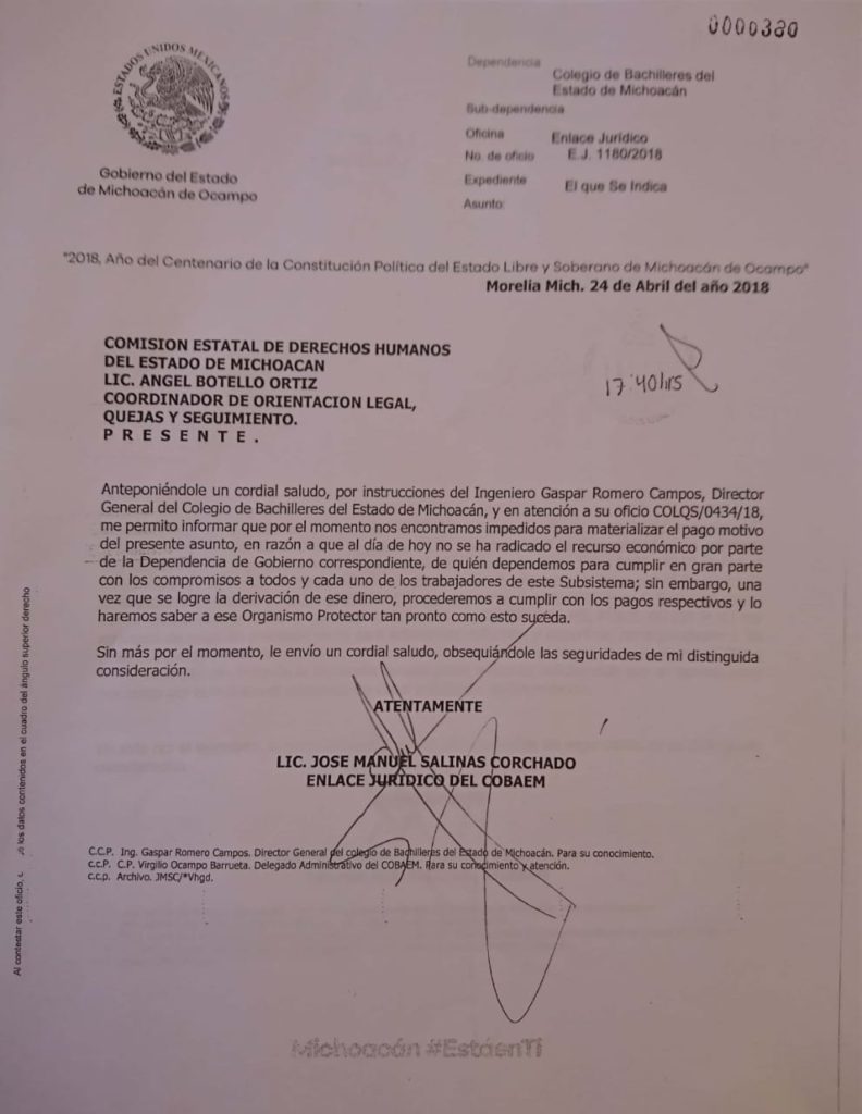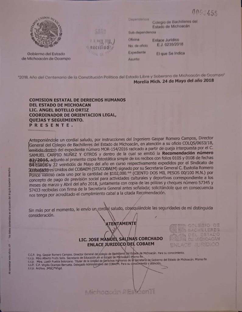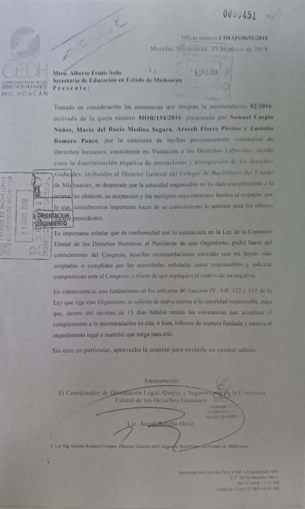 Morelia, Michoacán.- El secretario de Educación del Estado (SEE), Alberto Frutis Solís, deberá responder a la recomendación emitida por la Comisión Estatal de Derechos Humanos (CEDH), y actuar conforme a los efectos legales que le corresponden, en relación a la negativa del director general del Colegio de Bachilleres de la entidad, Gaspar Romero Campos, por la negativa a otorgar las prestaciones no económicas a los agremiados del Sindicato de Trabajadores Unidos del Colegio de Bachilleres del Estado de Michoacán (Stucobaem).