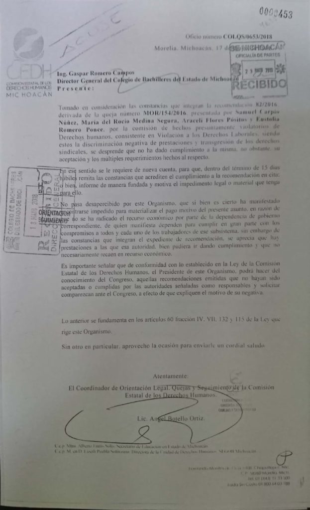 Aunque la comisión notificó la recomendación al director Gaspar Romero, éste tan solo respondió que se pagaron 102 mil pesos, pero evadió aclarar la negativa a otorgar las prestaciones que no son económicas a los sindicalizados.