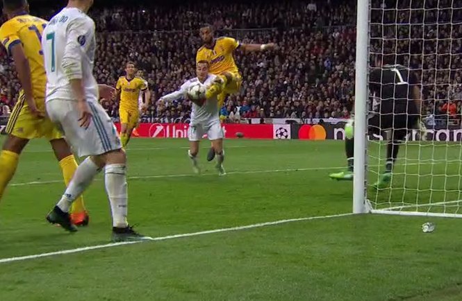 Lucas Vázquez cayó dentro del área rival en una jugada no muy clara con Venaglia que el árbitro inglés Michael Oliver sentenció como penal para la Juventus que fue claramente acuchillada. Buffón por protestar la acción se tuvo que ir del partido por tarjeta roja.