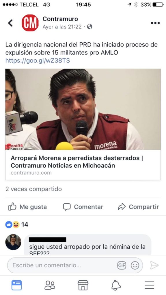 El diputado federal no ha sido el único que emitido comentarios críticos al anuncio del líder estatal de Morena, pues otros seguidores de Contramuro.com han cuestionado el apoyo que otorgará este partido político a los perredistas expulsados por manifestarse en favor de Andrés Manuel López Obrador en su carrera presidencial en los comicios del próximo año.