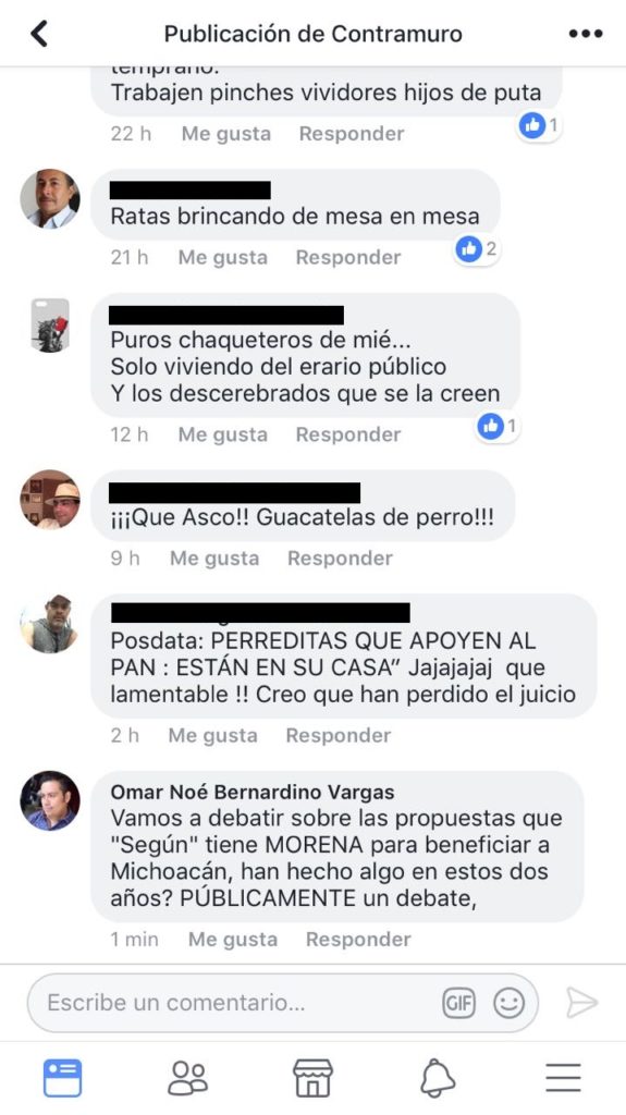 Entre los comentarios destacan de usuarios que han publicado: “sigue usted arropado por la nómina de la SEE???”; “La Misma mierda se junta en tarde o temprano. Trabajen pinches vividores hijos de puta”; “Ratas brincando de mesa en mesa”; “Posdata: PERREDITAS QUE APOYEN AL PAN : ESTÁN EN SU CASA Jajajajaj que lamentable !! Creo que han perdido el juicio”; “Arropan a los Perredistas mientras a los propios militantes los descobijan.”, entre otros.