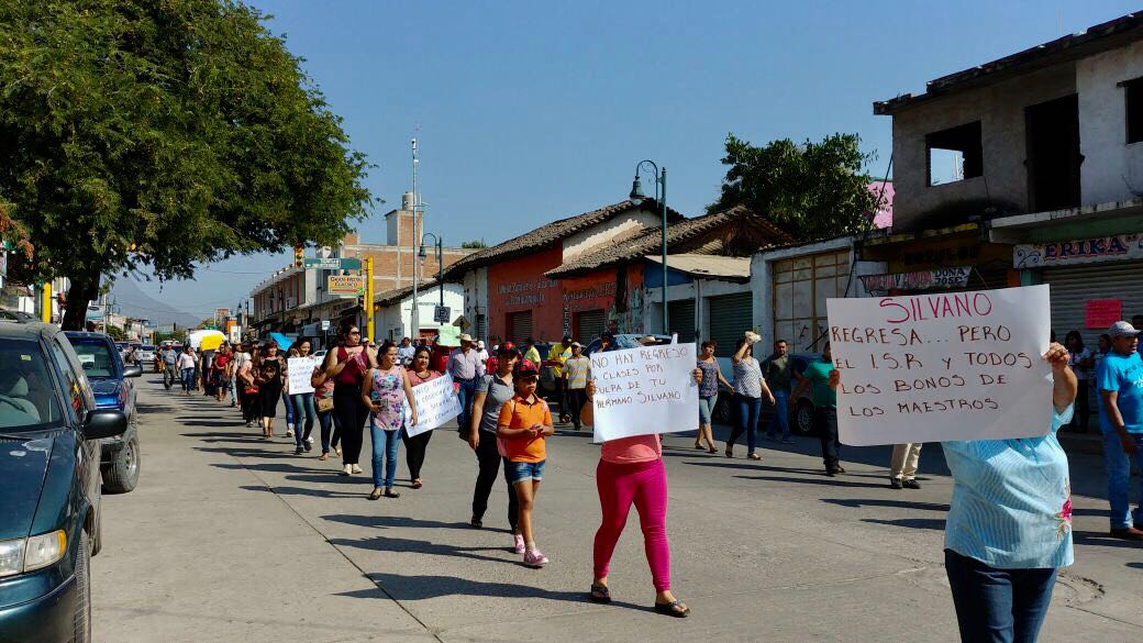 Con pancartas, los manifestantes recriminaron el hecho de que, a su juicio, el gobernador, Silvano Aureoles Conejo, esté promoviendo el financiamiento de la campaña de su medio hermano, Antonio García Conejo, cuando los pendientes económicos son muchos en el sector educativo.