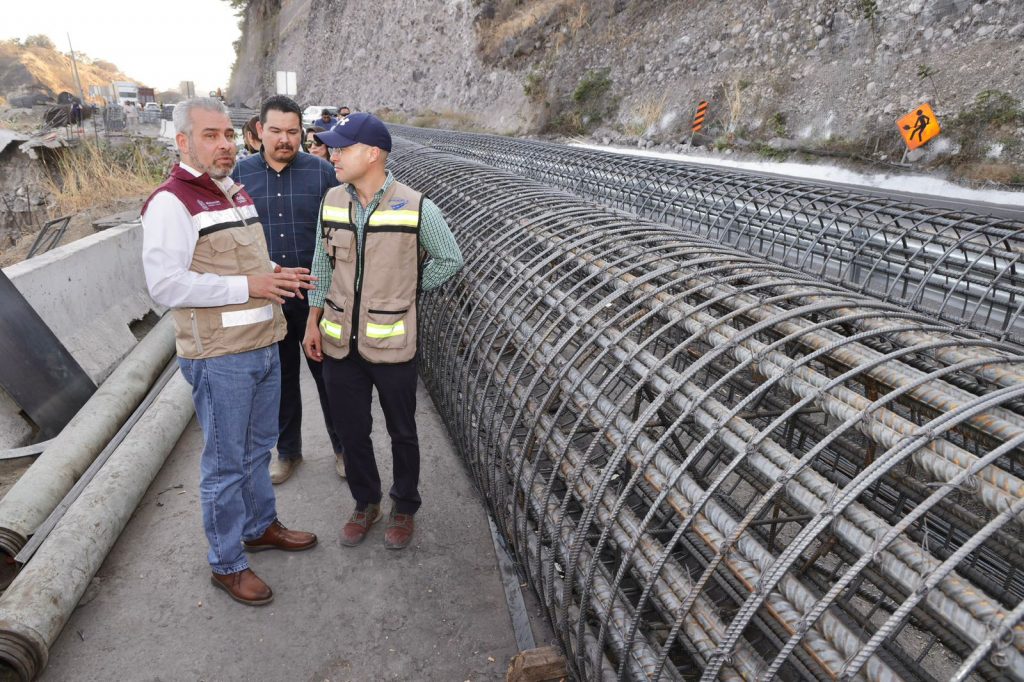 El mandatario estuvo acompañado de David León, representante de la concesionaria federal, quien le explicó los avances de la construcción en la infraestructura dañada por un deslave en el año 2021.
